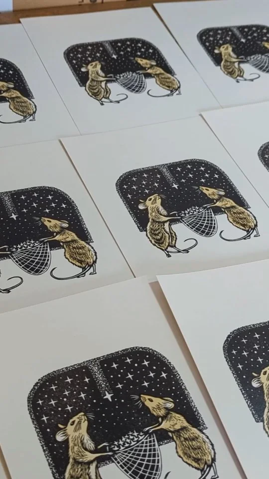 Whimsical hand-printed linocuts, inspired by fairy tales and childhood stories.