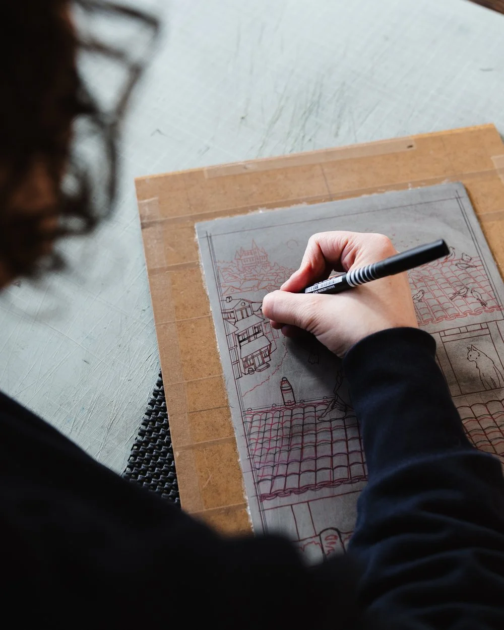 Although the process is simple, it can take me a long time to complete a final print from the first sketch. After sketching an idea several times, the final composition is transferred onto the lino block. I’ll start slowly cutting out the lino using my tools, carving out the negative space and leaving behind the positive to be inked up. I often leave marks to chance and decide in the moment how I’ll create texture within the block. By layering colours, I’m able to achieve a warm depth in my illustrations that I just can’t do with pencil or pen. Using this printmaking process really brings my ideas to life.